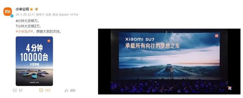 更令人矚目的是,新車在發(fā)布后僅4分鐘內(nèi)便突破萬輛大定,7分鐘內(nèi)更是飆升至2萬,上市短短27分鐘便鎖定了5萬臺訂單,完美詮釋了“上市即熱銷”的盛況,小米汽車也因此被賦予了繼特斯拉之后“新鲇魚”的稱號,SU7更是成為了2024年汽車界萬眾矚目的焦點(diǎn)。
