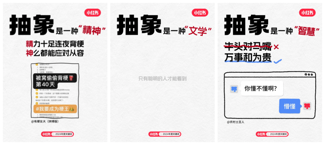 隨著2024年度關(guān)鍵詞“搞抽象”在小紅書上的火爆,我們不難發(fā)現(xiàn),無論是用戶對于生活哲學(xué)的深度探索,還是對于藝術(shù)、文化乃至日?,嵥槭挛锏莫?dú)特詮釋,都以一種前所未有的熱情被記錄與分享。