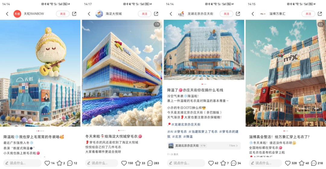 還記得今年冬天那些“穿毛衣”的購物中心嗎?首先發(fā)布的一波AI制圖“購物中心穿毛衣”海報(bào),確實(shí)有些以假亂真,讓很多消費(fèi)者看到了一群可可愛愛的商場。這些購物中心將主形象通過“穿毛衣”這一事件變得更加擬人化,靠不同的“穿搭風(fēng)格”烘起線上平臺的話題討論熱度,也讓消費(fèi)者看到了官方的親近與真誠。