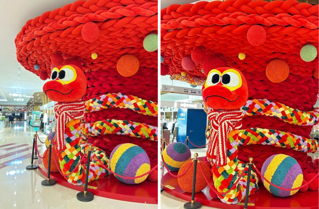 在即將到來的蛇年,購物中心開始陸續(xù)安排上了蛇年美陳。北京世紀(jì)金源購物中心也不例外。它選擇將毛線與蛇元素相結(jié)合,帶來一棵神蛇許愿樹。整棵樹都由毛線編織纏繞而成,五彩斑斕的神蛇盤繞許愿樹,還給自己帶上了一條圍巾,略顯可愛,也不失喜慶的氛圍。