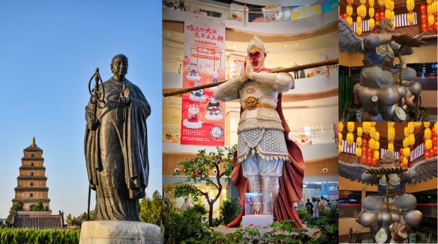 以西安大悅城為例,他深挖大唐、長(zhǎng)安歷史文化底蘊(yùn),與在地城市地標(biāo)形成呼應(yīng),中庭悟空與大雁塔玄奘雕像隔街對(duì)望,并打造契合潮流時(shí)尚客群訴求的“勿空”美食街區(qū)與“不戒食巷”,街區(qū)內(nèi)的墻體上還有師徒四人取經(jīng)歸來的立體壁畫,讓原本只以美陳形式存在的孫悟空、豬八戒變成文化傳播的紐帶。